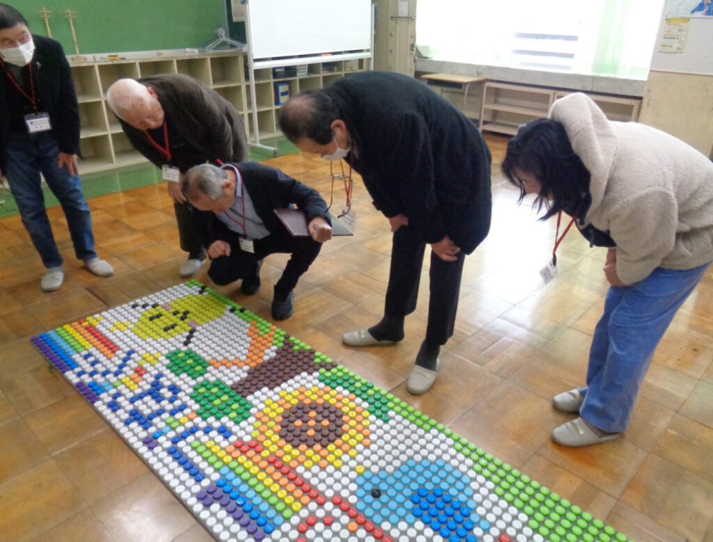 第4回学校運営協議会が行われました。授業参観の際、委員の皆様にできあがったキャップアートを見てもらいました。今年度が半分なので、「教育目標全体だとなかなか大きくて迫力があるね。」などの声が上がりました。