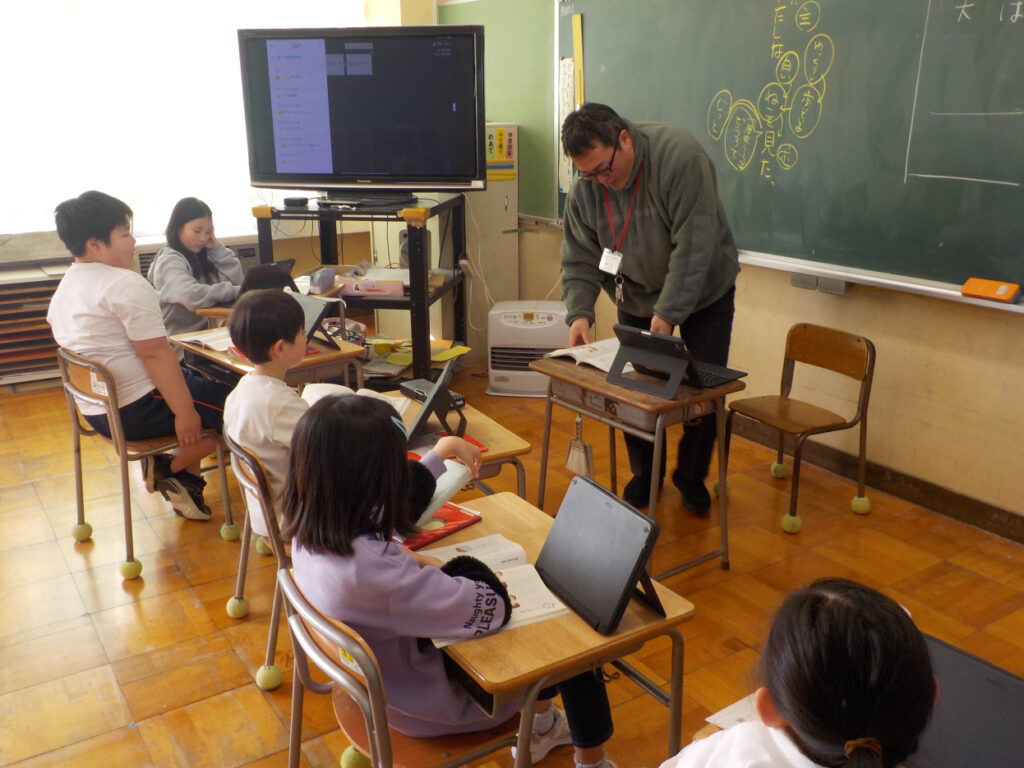 3年生は国語で、「くわしくする言葉」を学習していました。「〇〇な猫」であれば、〇〇に入る形容詞が猫を「くわしくする言葉」、つまり修飾語になります。子どもたちは、主語と述語だけの文に「くわしくする言葉」を付け加えて、主語や述語の様子がさらに詳しくわかる文にしていました。