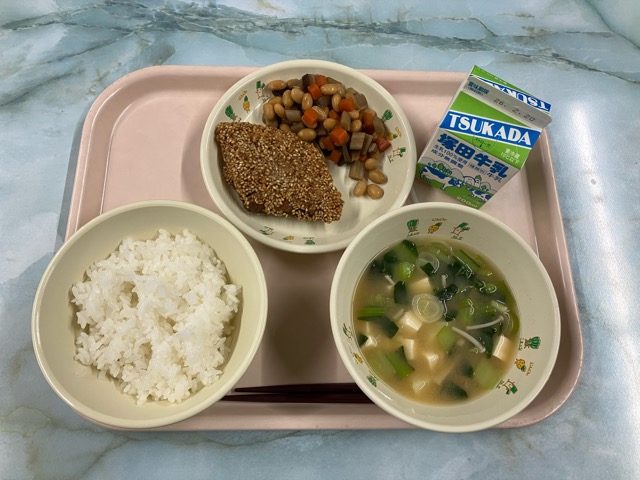 ご飯、じゃがいもの味噌汁、サバの胡麻揚げ、五目豆、牛乳 でした。