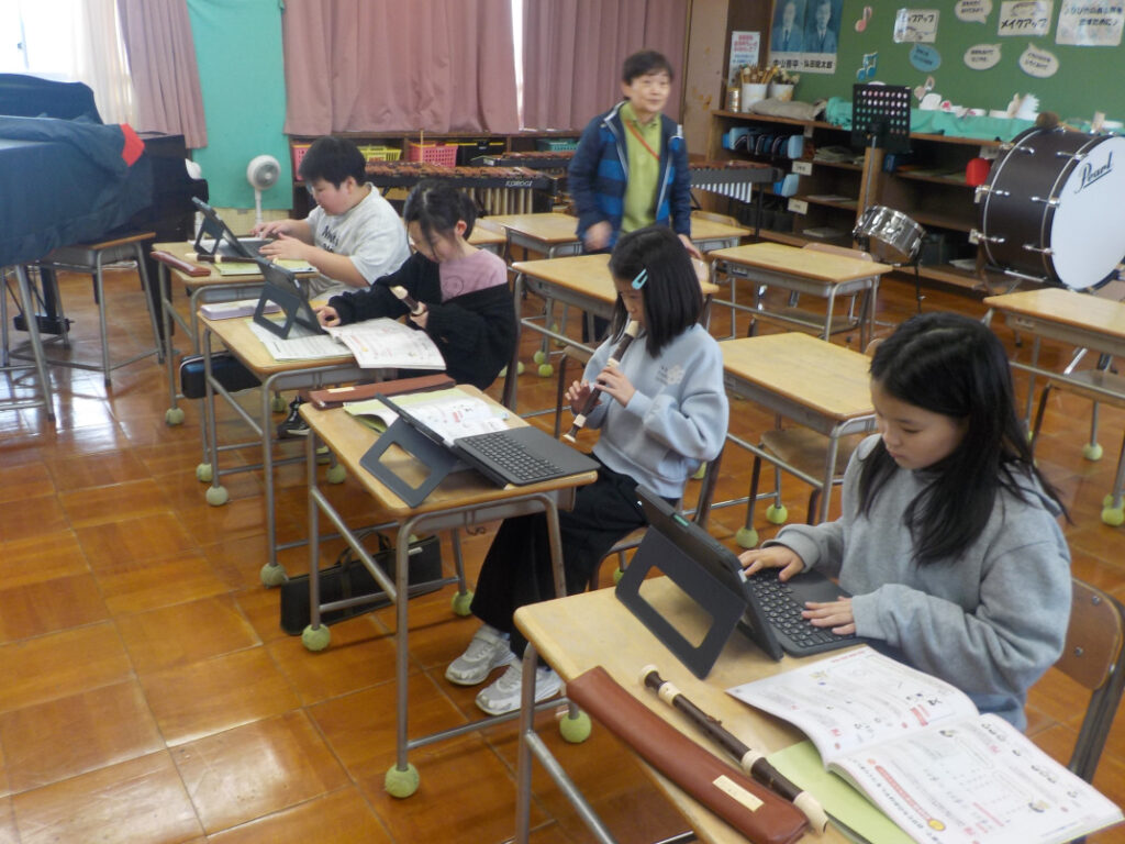 3年生は音楽で、お囃子のふしをつくりました。ド、レ、ラの音を使うと日本のお囃子の音階になります。リコーダーを使って、音を探りながらふしをつくりました。つくったふしを互いに演奏したり、リレーでつないだりしました。