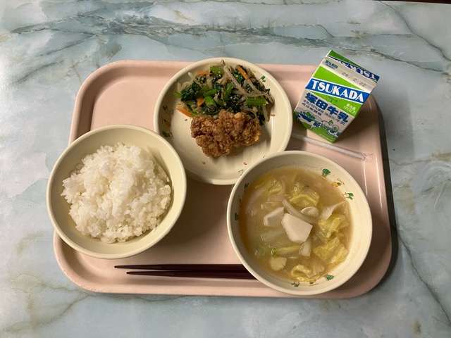 ご飯、白菜の味噌汁、鶏肉の竜田揚げ、ゴマ酢和え、牛乳 でした。