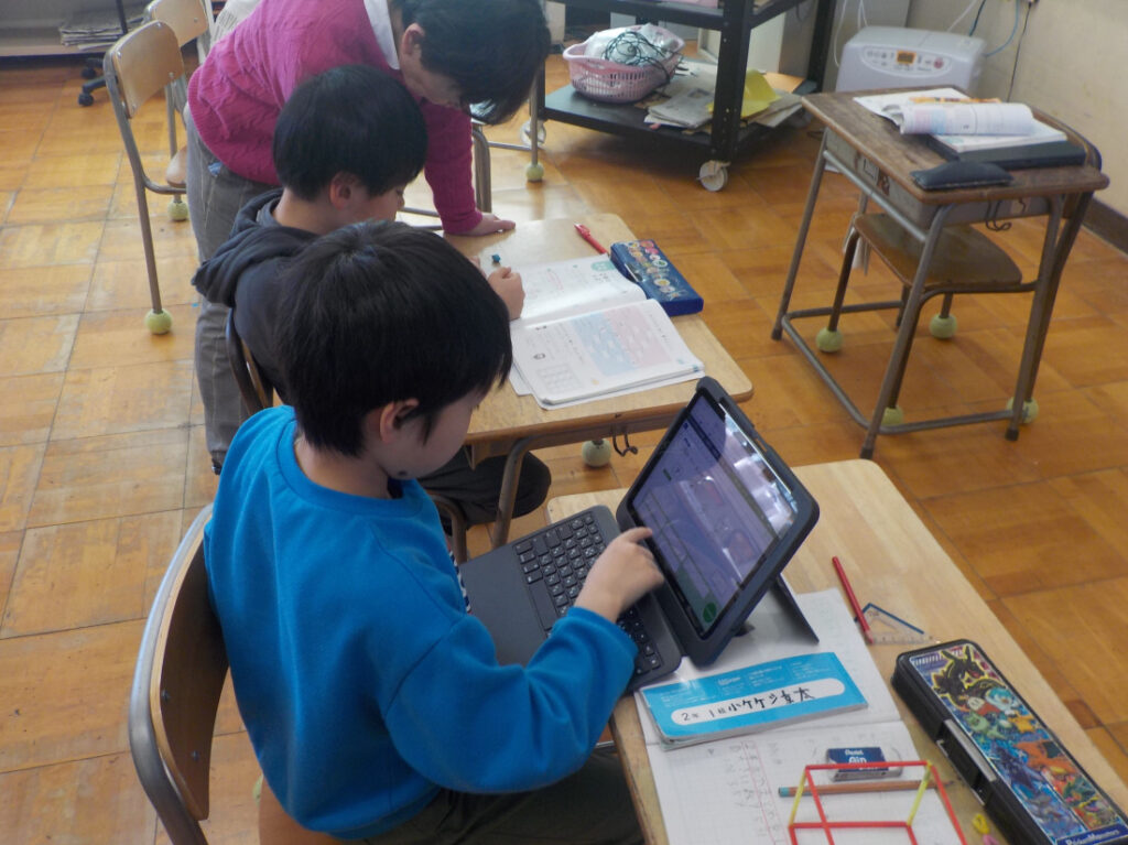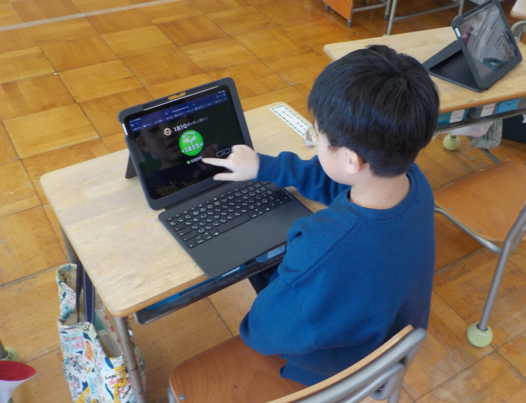 1年生はタブレットで学習したことを復習していました。正解するとポイントがたまるので、たまったポイントを自信満々に見せてくれました。自分から進んで学習を進められている様子に感心しました。
