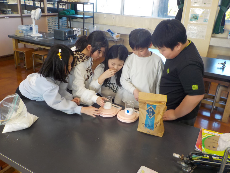 3年生が理科の実験で、体積と重さについて調べていました。食塩と砂糖で同じ体積を測り、重さを比べてみました。食塩がかなり重いことに子どもたちは驚いていました。一見同じように見えても、物質の重さには違いがあることがわかりました。