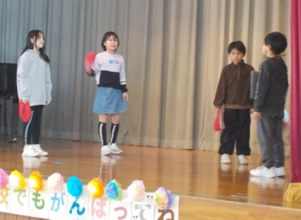 6年生からのお礼は、一人一人の個性がよく出た楽しいパフォーマンスでした。運動やピアノ、そして、最後は3人の息がぴったり合ったステキな「威風堂々」の合奏でした。