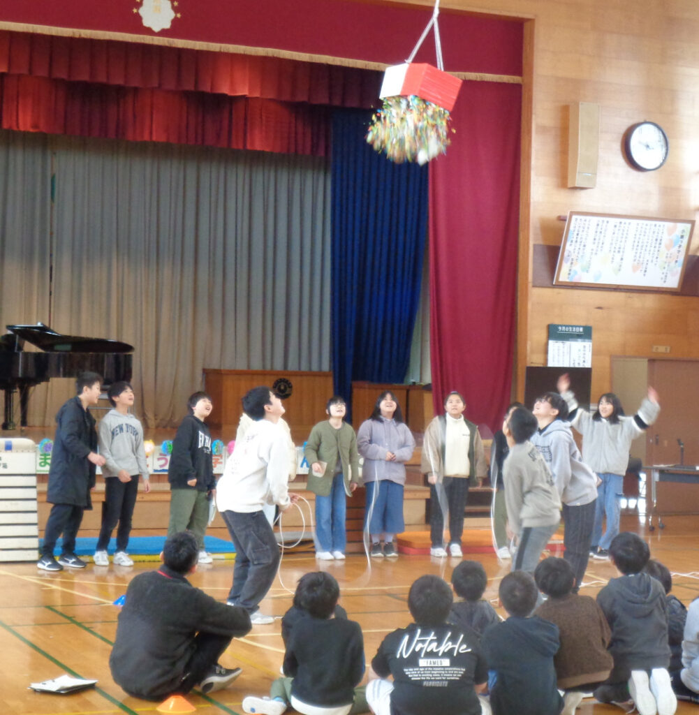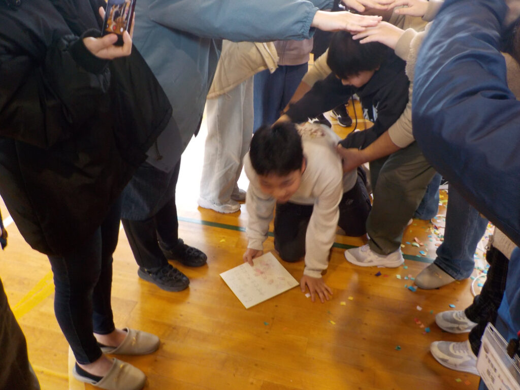 最後にカウントダウンでくす玉を割りました。きれいに割れて、「6年生いつもありがとう!中学でもいい思い出つくってね!」が飛び出しました。