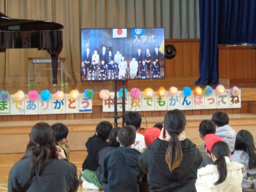 5年生の6年生懐かしのスライドショー。1年生から6年生までのたくさんの写真を5年生が編集しました。