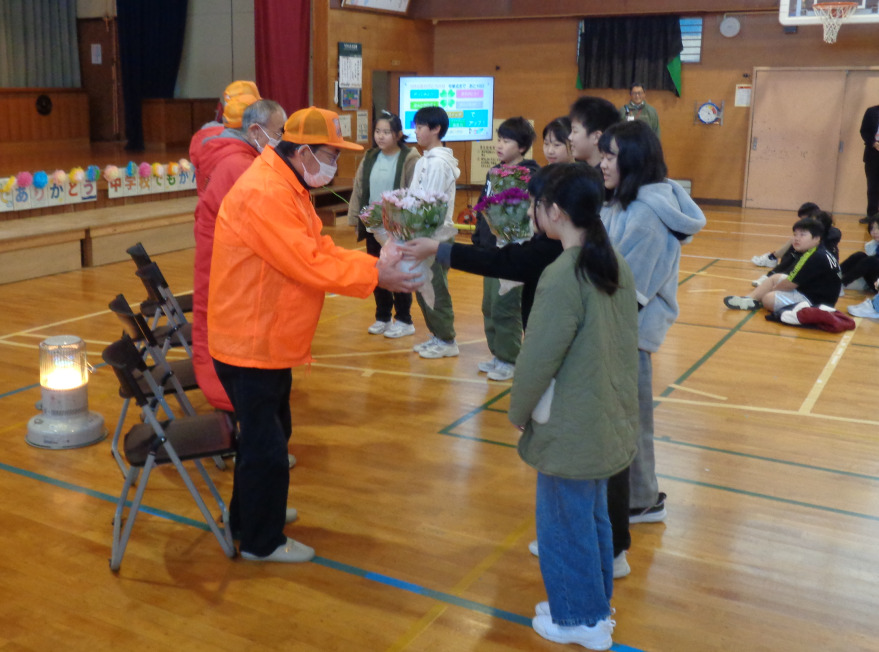 続いて、見守り隊の方々への感謝の会を行いました。見守り隊の方から一言ずつお話をいただき、6年生がお礼の言葉を伝え、5年生からは鉢植えを渡しました。その後、見守り隊の方々と情報交換を行いました。毎日見守っていただいていることに、心から感謝です。本当にありがとうございます。
