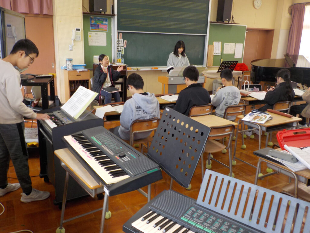 5・6年生は音楽で、担任の先生を招いて、今まで学習してきた楽曲を歌ったり、演奏したりしました。「それぞれの空」を合唱し、「キリマンジャロ」「木星」「威風堂々」「アフリカンシンフォニー」を合奏しました。担任はとても感動して、たくさんの長い曲をよく覚えたことなどを称賛し、アンコールとして「威風堂々」をリクエストしていました。ステキな演奏会になりました。