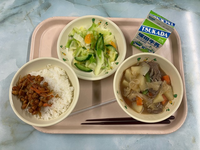 ご飯、肉じゃが、鉄火みそ、フルーツ漬け、牛乳 でした。