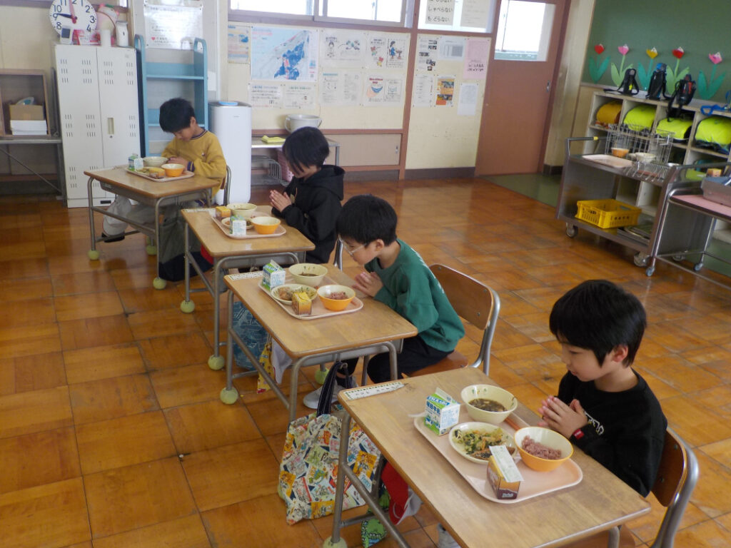 今年度最後の給食は、6年生にとって、小学校生活最後の給食になります。5・6年生が、牛乳で6年生に、乾杯!していました。きっと、小学校最後の給食の味は格別だったことでしょう。