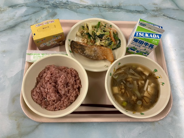 今年度最後の美味しい給食は… 赤飯、もずくの味噌汁、マスの竜田揚げ、アーモンド和え、お祝いケーキ(チョコ)、牛乳 でした。