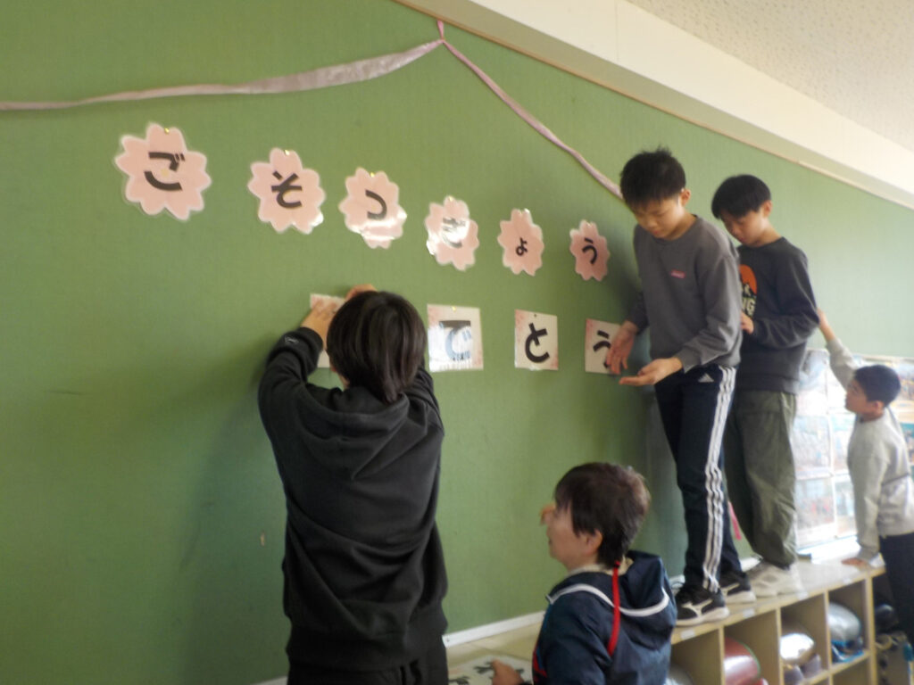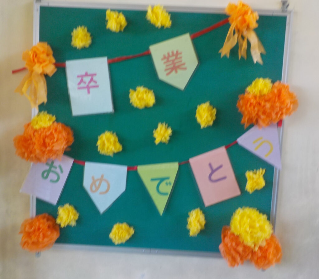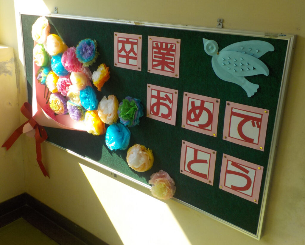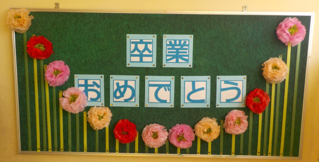 学校のあちらこちらに「卒業 おめでとう!」が…。明日はいよいよ卒業式。心を込めて卒業生を送り出します!