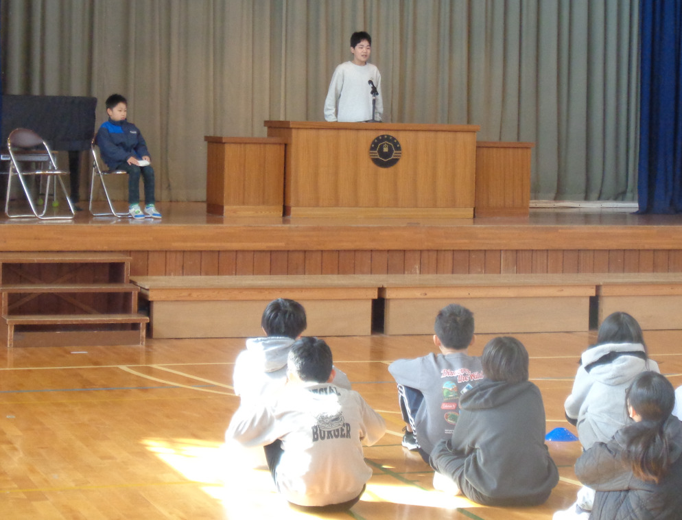 令和7年度後期の終業式を行いました。校長との挨拶の代表は6年生3人でした。校長からは、最後にちなんで「お・わ・り」の話がありました。「お」は思い出、「わ」はワクワク、「り」はリズムです。春休みに思い出を大切にして成長を振り返り、来年度の活動を考えてワクワクを高め、行動時刻を決めて生活のリズムを大切にするように話がありました。2年生と6年生の代表2人からは、後期頑張ったことの発表がありました。2年生はなわとびや挨拶をがんばったこと、6年生からは6年間で一番の思い出や中学校で頑張っていくことを発表しました。全校一人一人が、自分の成長を振り返って、新たな学年に力強くステップしてほしいです。
