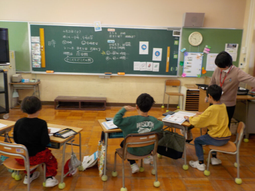 2年生は算数で、時間の学習をしていました。日々、時刻を見て、時間を考えて行動できるようになると、算数の学習とつながっていきます。休み時間も時計を見て、「あと休み時間は何分?」などと考えて遊びを切り上げて、学習に入る心と頭と道具の準備ができるとよいですね。