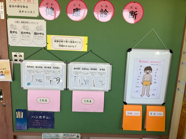 保健室前の掲示がリニューアルされました。健康診断に関する掲示です。4月から様々な健康診断が始まっています。健康診断は、自分のからだを知る大切な役割を果たしています。健康診断の結果から自分のからだを見つめ、大切にしていってほしいです。