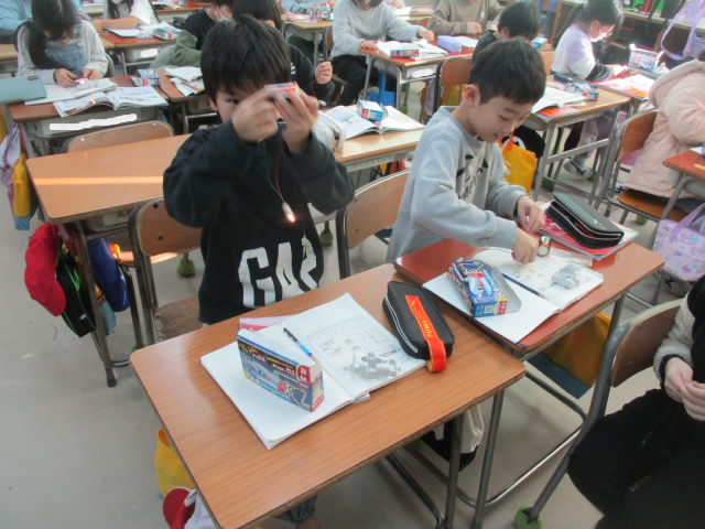 1年生は,家から持ってきた様々な空き箱を使って学習していました。この空き箱は,造形遊びにすると図工,形の特徴に注目すると算数での学習になります。まさに「二刀流」の使い道があっていいね! …