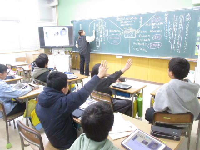 今,5年生は国語で「敬語」の学習をしています。タブレットにあるY字チャートを使って,敬語の言葉を尊敬語,謙譲語,丁寧語の三つに分類していました。三つの特徴を考えながら積極的に発言しているところが「 …