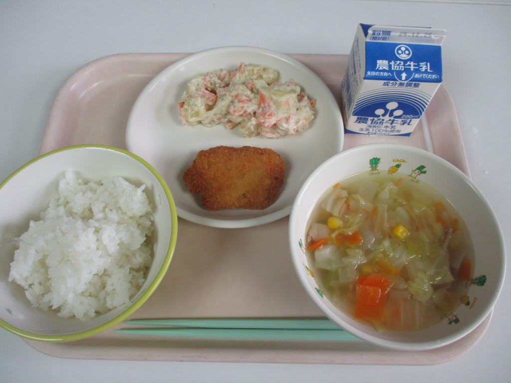 今日から1年生の給食が始まりました。メニューはカレーライス。理由は,多くの子どもが大好きなメニューであること,盛り付けが比較的簡単であること。副菜は,さっぱりコーンサラダで,お祝いデザートも付きま …