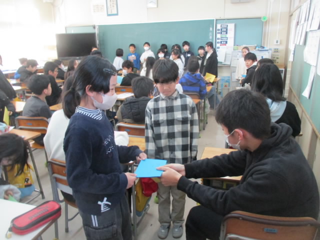 3年生は国語の時間でつくった詩の発表会をしていました。自由に二人組なり,読んだ後,表現が工夫されているやいいところを付箋に書いて相手に渡します。友達のつくった詩をじっくりと読んでいる姿が「いいね! …