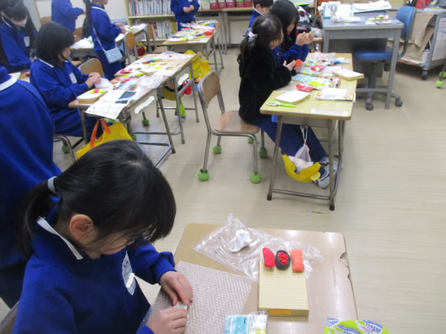 1年生の図工は「スルスルビューン」という工作を作っています。直方体の箱に折り紙や色セロハンを付けて乗り物や動物を作ります。それを糸ロープにかけて滑り下ろします。カッコよく滑る様子を楽しんでいる姿が …