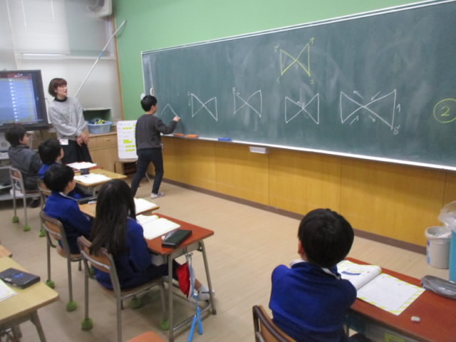 1年生算数の「かたちあそび」の学習では,立体の箱を段ボールに入れて,手触りでどんな形かを当てる活動をしていました。角があるもの,丸いもの,細長いものなど,指の感覚で形を確かめている姿が「いいね!」 …