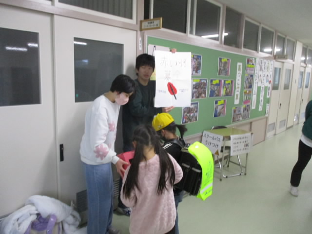 1年生算数の「かたちあそび」の学習では,立体の箱を段ボールに入れて,手触りでどんな形かを当てる活動をしていました。角があるもの,丸いもの,細長いものなど,指の感覚で形を確かめている姿が「いいね!」