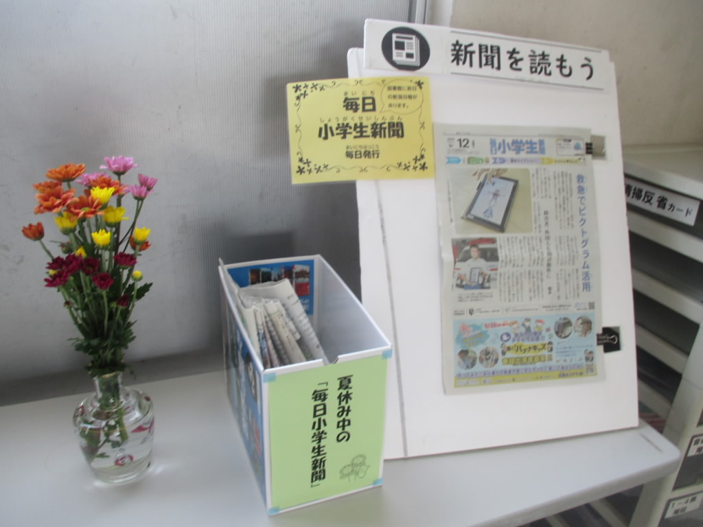 3階の6年生の教室前廊下には,小学生新聞のコーナーがあります。ここで最新のニュースが写真と記事で分かりやすくゲットできます。花も飾られていて,ちょっとした一息コーナーにもなっていて「いいね!」