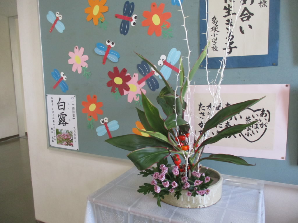 職員玄関は入り口の生け花も一新し,秋らしく落ち着いた華やかさで映えています。いつも学校を訪問する方々の目と心を潤し,癒してくれる名物コーナーになっていて「いいね!」