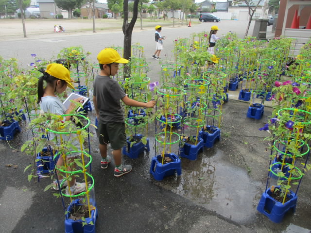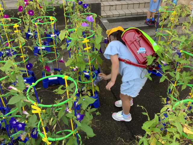 1年生が4月から育ててきたアサガオは開花が盛りを過ぎ,種が実り始めています。登校後,いつものように水をあげてから,種があるかどうかを確認します。実った種は教室へ持ち帰ります。自分だけのアサガオを最後の最後まで大切にお世話してあげると「いいね!」