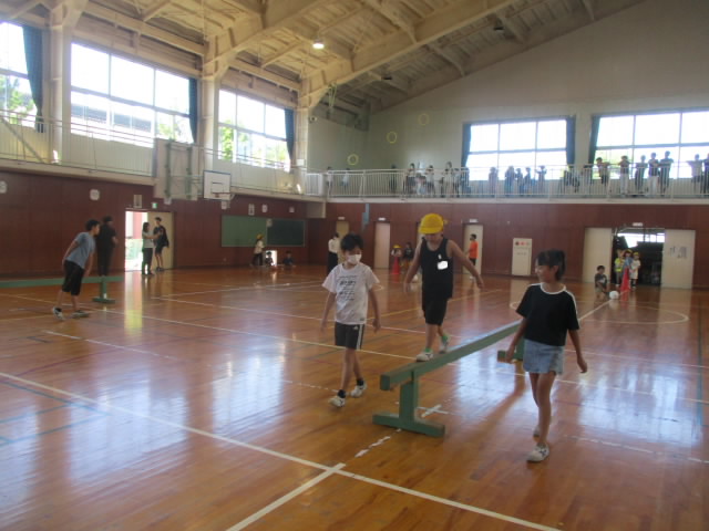 今週の昼休みに,運動委員会主催の障害物競走が開催されます。今日は,1年生と6年生のペアで仲良く楽しく競技をしていて「いいね!」