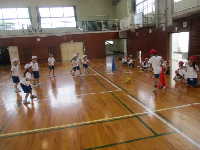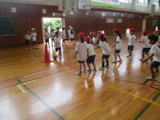 1年生は体育で,ボールを蹴る運動としてキックベースボールを楽しんでいました。蹴られたボールを捕って,そこに守備全員が集合するとアウト!守備が手薄なところを狙いすまして蹴っている作戦が「いいね!」
