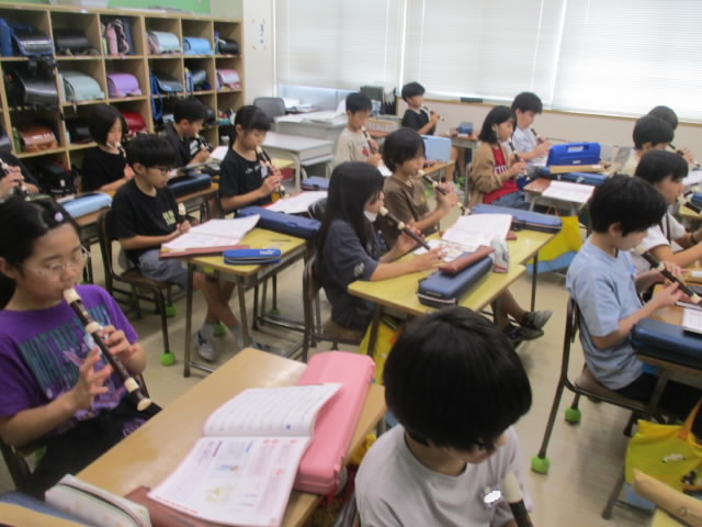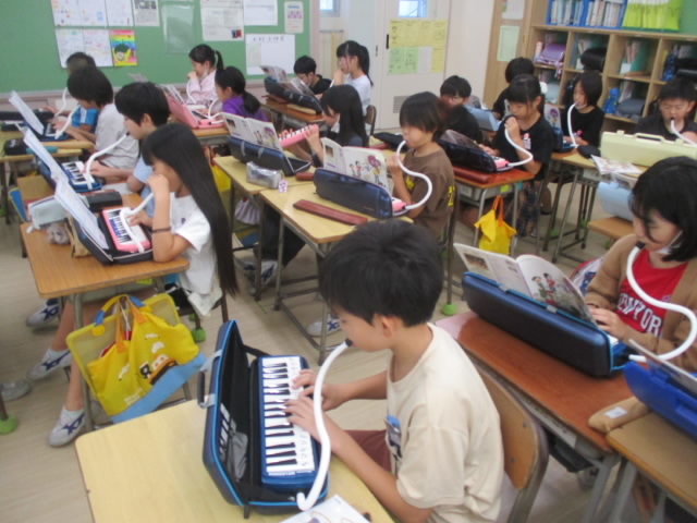 4年生の音楽では,1学期に学習した楽曲を順番に演奏していました。テンポのよい「陽気な船長」は鍵盤ハーモニカで,旋律がなめらかな「風のメロディー」はリコーダーで,気持ちよく吹いている姿が「いいね!」