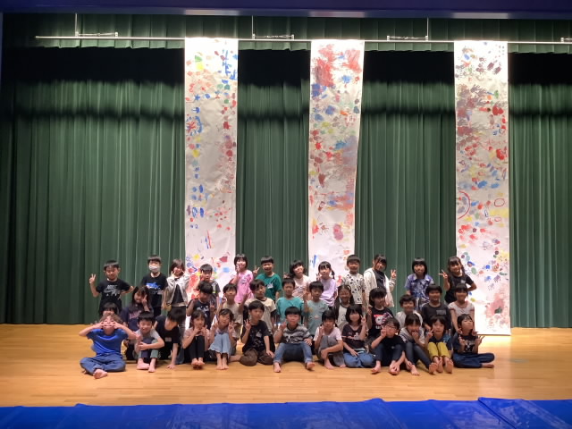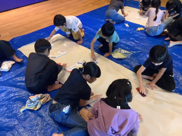こども創造センターでは,指絵の具体験をしました。手の平や指に絵の具を付けて白い台紙にべたべた塗っていくという大胆な活動です。完成して吊るして展示して遠くから眺めると芸術作品みたいになって「いいね!」