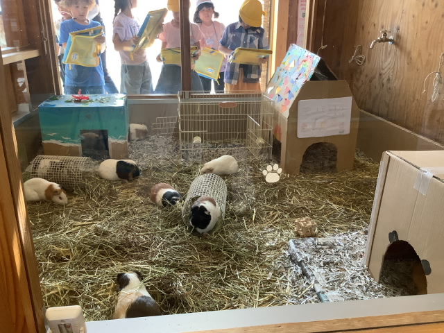 どうふつふれあいセンターでは,動物検定をして楽しみました。「うさぎのうんちはどんなかたち?」などの3択問題を回りながら解いていきます。アルパカも出迎えてくれて「いいね!」