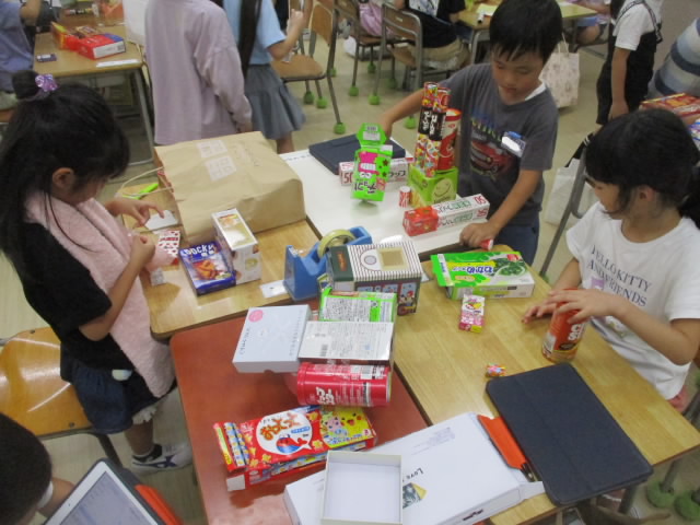 1年生は,家から持ってきた様々な空き箱を使って学習していました。この空き箱は,造形遊びにすると図工,形の特徴に注目すると算数での学習になります。まさに「二刀流」の使い道があっていいね!