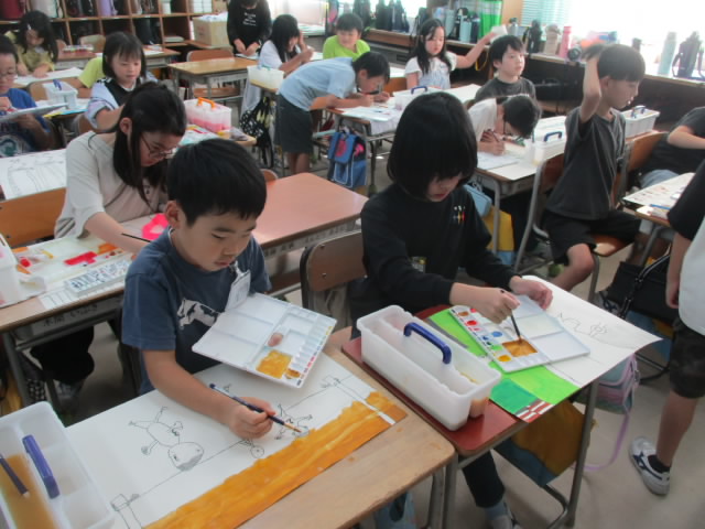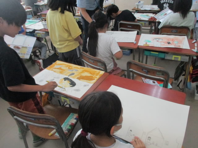 3年生は図工で「あの日あの時の思い出」を絵に描いています。夏休みや学校での体験を思い出して下書きをして、今は絵の具で彩色しています。色を混ぜてその場面に合った色をつくって丁寧に塗っているところが「いいね!」