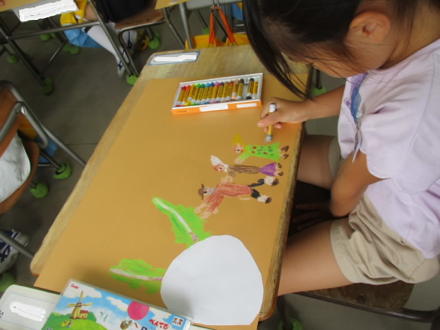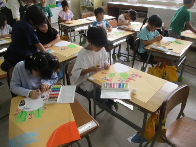 1年生は図工で,国語で学習した「おおきなかぶ」のかぶを引き抜く場面を絵にしています。白い画用紙に描いて切り取ったかぶを土色の画用紙に貼り,登場人物が一生懸命に引っ張る様子を熱心に描いている姿が「いいね!」