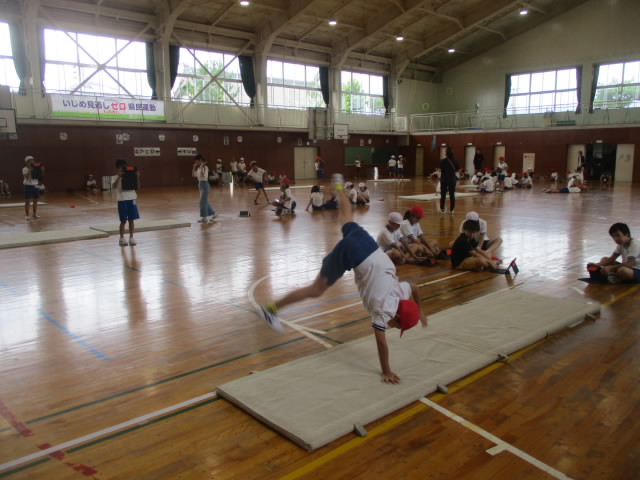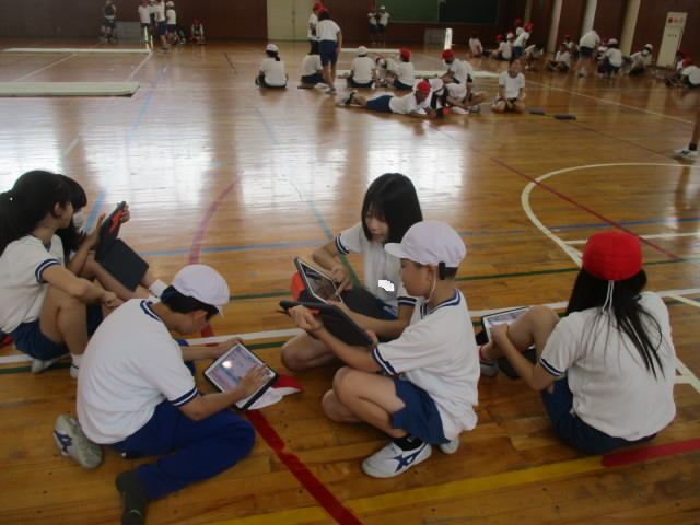5年生は,体育で雨の日はマット運動に取り組んいます。開脚前後転・側転などの技に挑戦しています。自分の試技をタブレットで動画撮影して,自分で見たり,見せ合ったりして自分の動きをチェックしている姿が「いいね!」