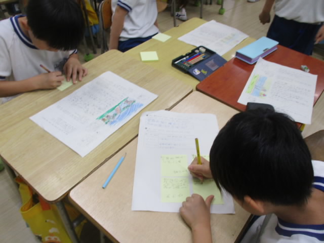2年生の国語では,創作物語を書きました。今日は,友達の書いた物語を読んで,付箋に面白かったところなどの感想を書いて読み合っていました。とても意味のある学びの交流ができるようになって「いいね!」