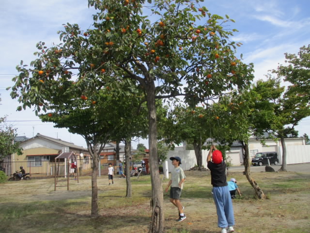 グラウンドの端に植わっている柿の木がたくさんの実をつけています。子どもたちは何とか採りたいと,幹を蹴ったり枝を揺らしたりしています。残念ながら,この柿の実は安全上食することができません。見ることで秋の季節を味わうだけでも「いいね!」