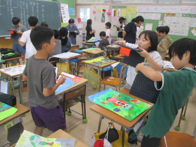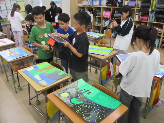 4年生は図工の学習で,描き終えた「お話の空想画」の鑑賞会をしていました。見回りながら,タブレットで友達の作品を写真に撮って,お気に入りの感想を書いてる姿が「いいね!」