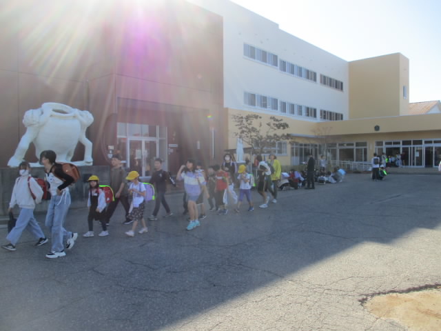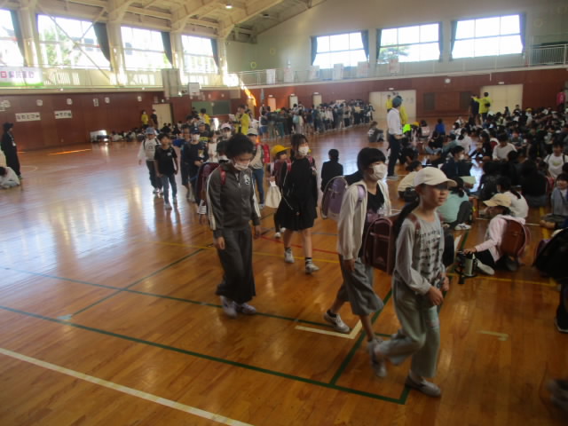 本日,今年度2回目の集団下校訓練が実施されました。集団下校は,震度4または5弱の地震(5強以上は引き渡し)が起こった時,学区内または近隣学区に刃物等をもった不審者事案があった時(危険度によっては引き渡し),近隣にクマやイノシシなどの禽獣が出たときなどに実施します。まず体育館の町内表示の下に,集団下校班ごとに集合・整列します。人員点呼の後,学校から遠い町内から班長を先頭に出発します。さわやかな秋晴れの中,真剣にしっかりと訓練ができて「いいね!」