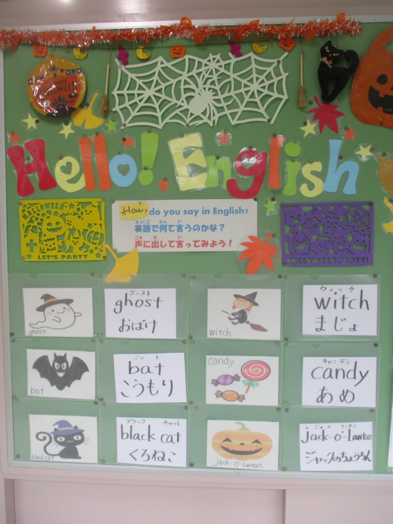 来週はハロウィーンです。4年生の廊下掲示には,お馴染みのキャラクターが英語で紹介されています。英語でもハロウィーンを楽しめて「いいね!」