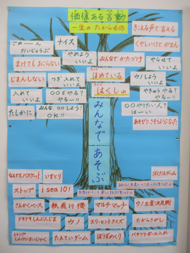 ポプラ学級のある教室は,価値ある活動を木の根,それから生まれる価値ある言葉を葉っぱに見立てた木が掲示されています。毎日の言動のガイドとなって「いいね!」
