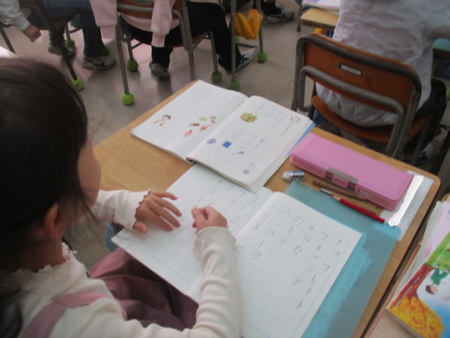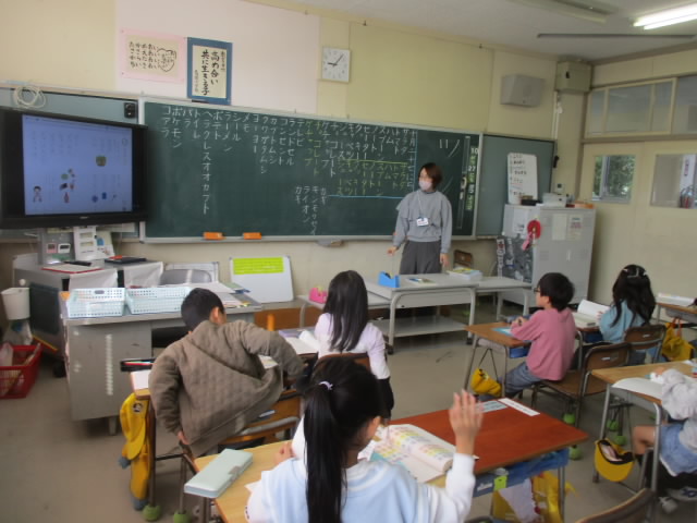 1年生は,国語でカタカナを練習しています。一通り書けるようになって,今日はカタカナの言葉集めをしました。黒板いっぱいにカタカナ語が並んで「いいね!」