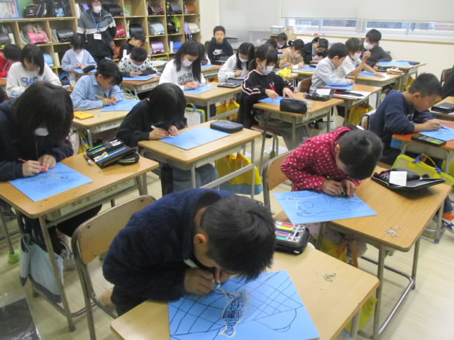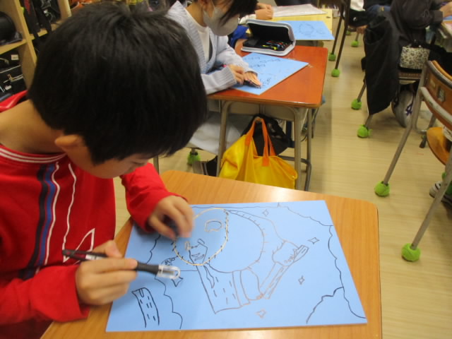 4年生は,図工で木版画に取り組んでいます。今回の版画で初めて彫刻刀を使います。下絵にそって,三角刀でゆっくり丁寧に彫っている姿が「いいね!」