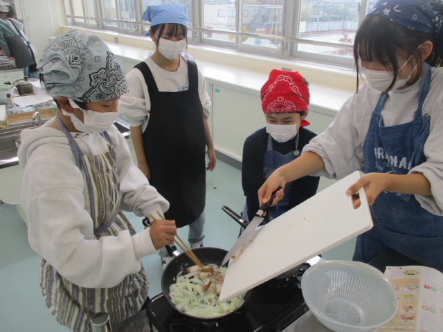 6年生は,家庭科で主菜としてジャーマンポテトを調理しました。じゃがいもや玉ねぎを手際よくカットし,肉厚のベーコンを幅2センチに刻み,最後はフライパンで炒めます。これまでの実習が生かされた手際のよさが「いいね!」