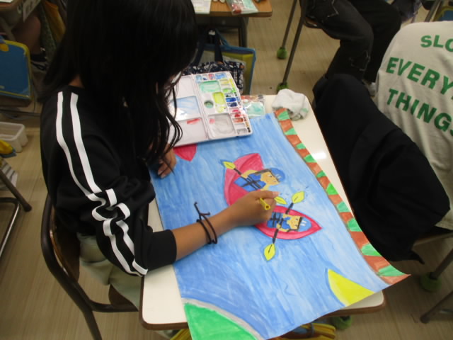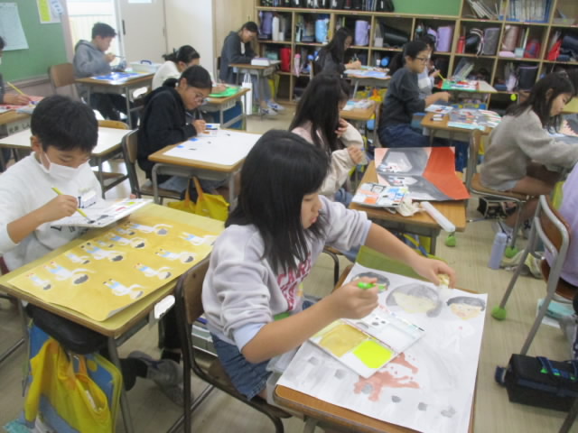 5年生は図工で,1学期の思い出を水彩画で描いています。自然教室や陸上大会,田植え・稲刈りなどの場面について,その様子が分かるように,絵の具を混ぜて効果的な色を作って,丁寧に塗っている姿が「いいね!」