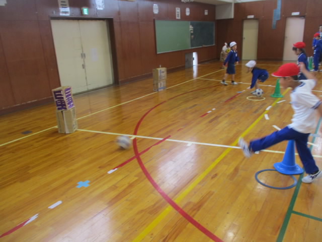 1年生の体育は,蹴る運動に取り組んでいます。段ボールを的にして蹴ったり,二人組でパスをし合ったりして練習していました。まっすぐに蹴られるようになって,はやくサッカーのゲームができると「いいね!」