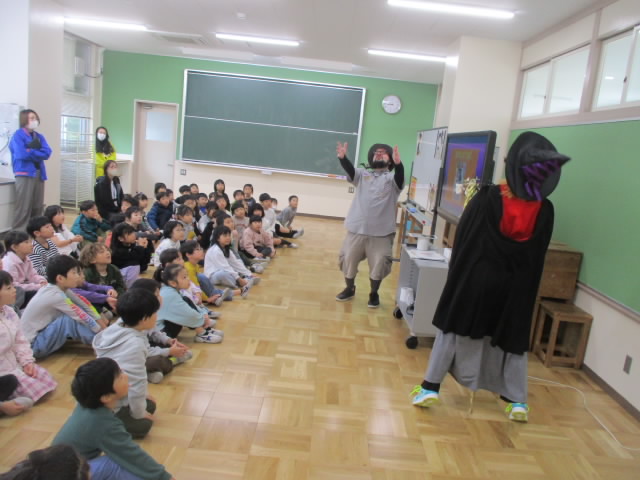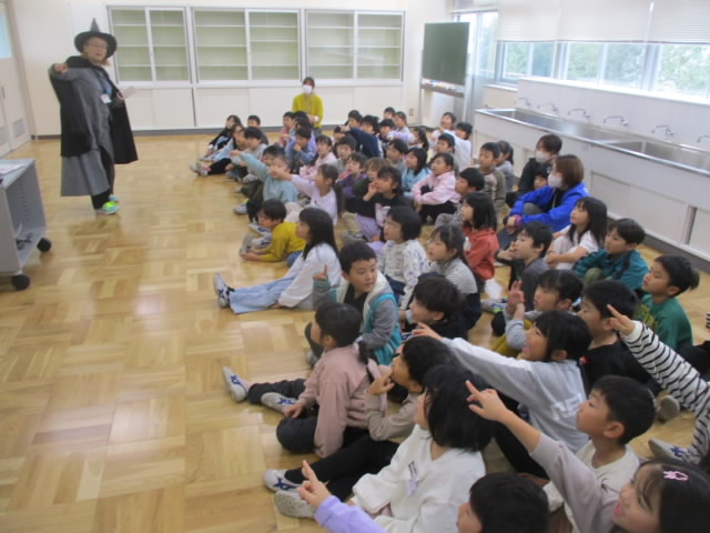 今日は,ハロウィーンの日。英語専科とALTの先生がタッグで,1年生のためにハロウィーンのプレゼンテーションをしてくれました。魔法使い(witch)のコスプレをした先生とドラゴンのフィギアを肩に乗せたALTが,外国のハロウィーンの様子やたくさんのお化けキャラクターを英語を交えて紹介していました。そのパフォーマンスに乗せられて子どもたちも大盛り上がりで,trick or treat!と元気に発音している姿が「いいね!」